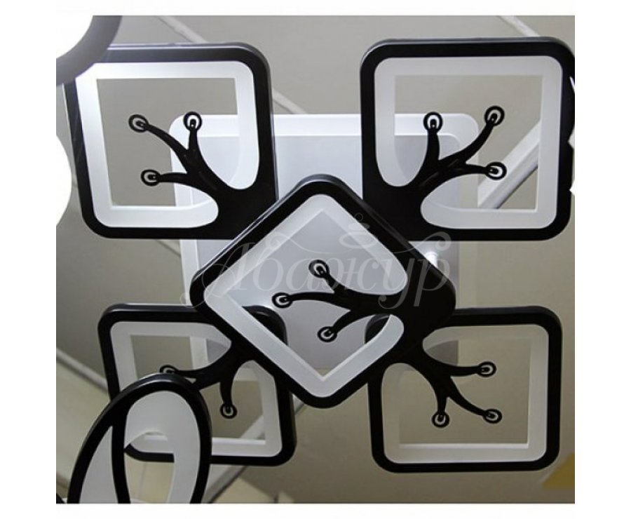 Светодиодная (LED) люстра изготовлена из металла с обрамлением под которым скрываются LED ленты. В люстре освещение включается с помощью пульта или выключателя..